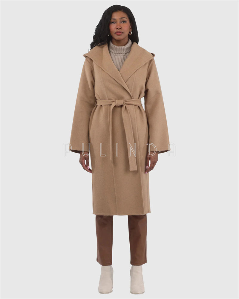 Belted Long Coat Wool Cashmere Trench Coat Classic Camel Color Leather Jackets for Ladies Over Knee Length